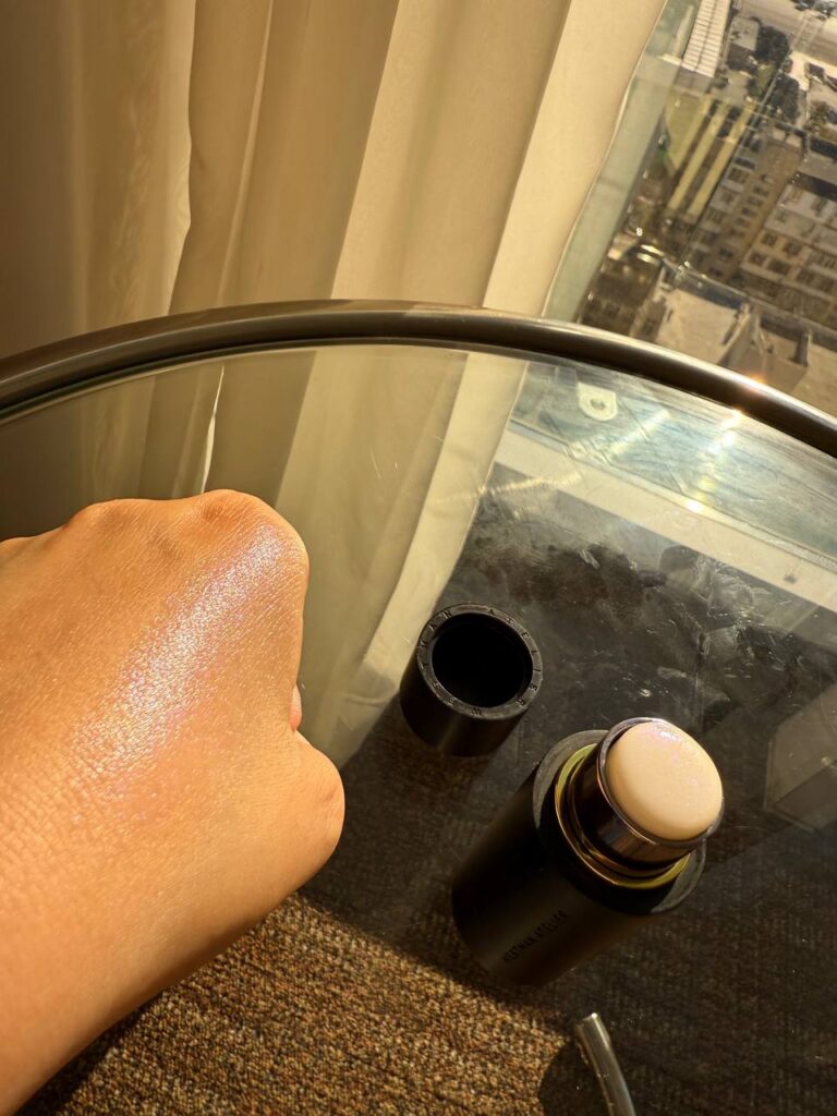 Westman Atelier Highlighter Stick in Lit is very different from the other shades in the line. From the first time I tried it, I realized this one is not about looking natural. Lit is bold, bright, and unapologetically cool toned. It does not try to melt into the skin quietly. Instead, it announces itself.