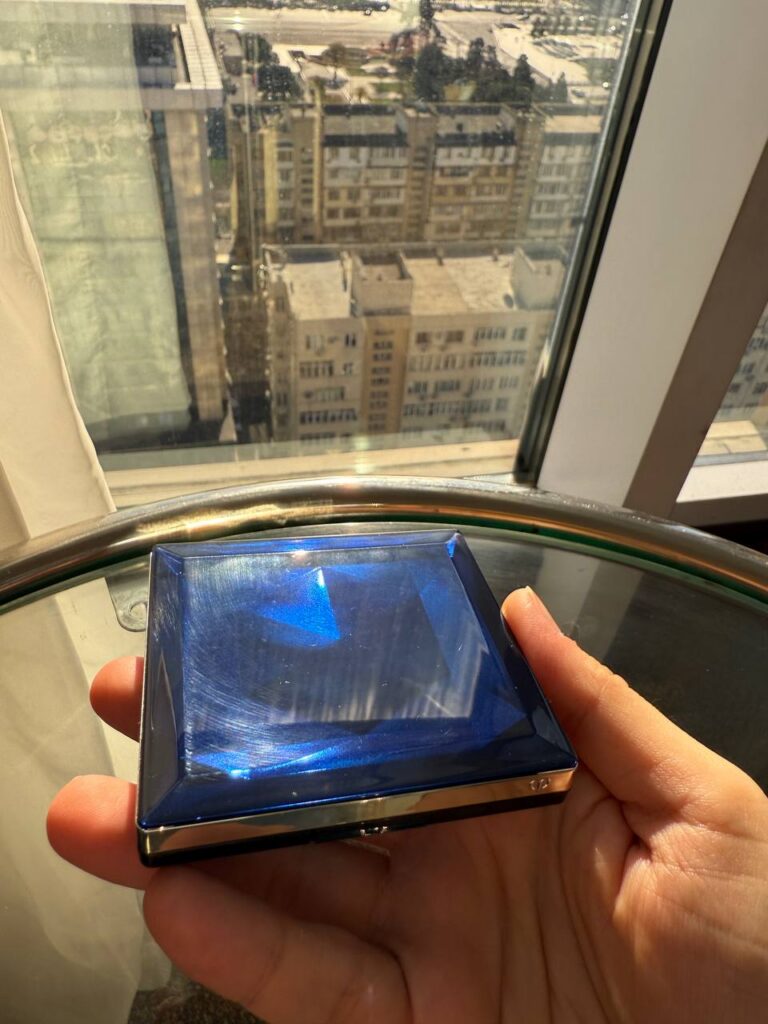 The packaging is beautiful. Cle De Peau really knows how to create a luxury feeling without being too heavy or uncomfortable. The compact comes in a deep sapphire blue color that looks very elegant. It shines softly under the light. The logo on top is minimal and classy.